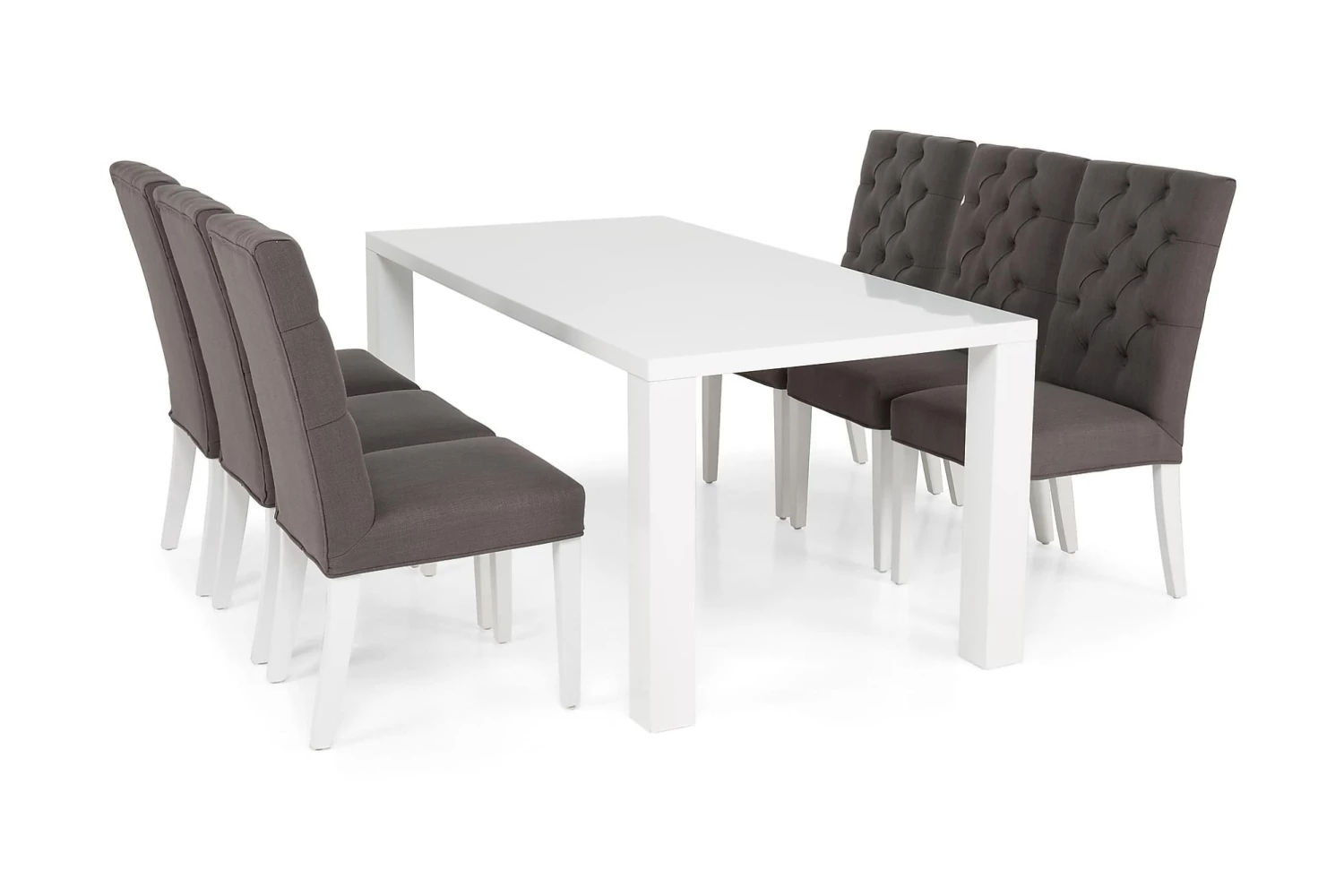 Cibus spisebordssæt er et sæt til det moderne hjem bestående af et aflangt bord og seks tilhørende spisebordsstole i sort kunstlæder. Den populære kombination af højglans lak og klassiske farver, giver spisebordsættet et luksuriøst look. Her sidder man be