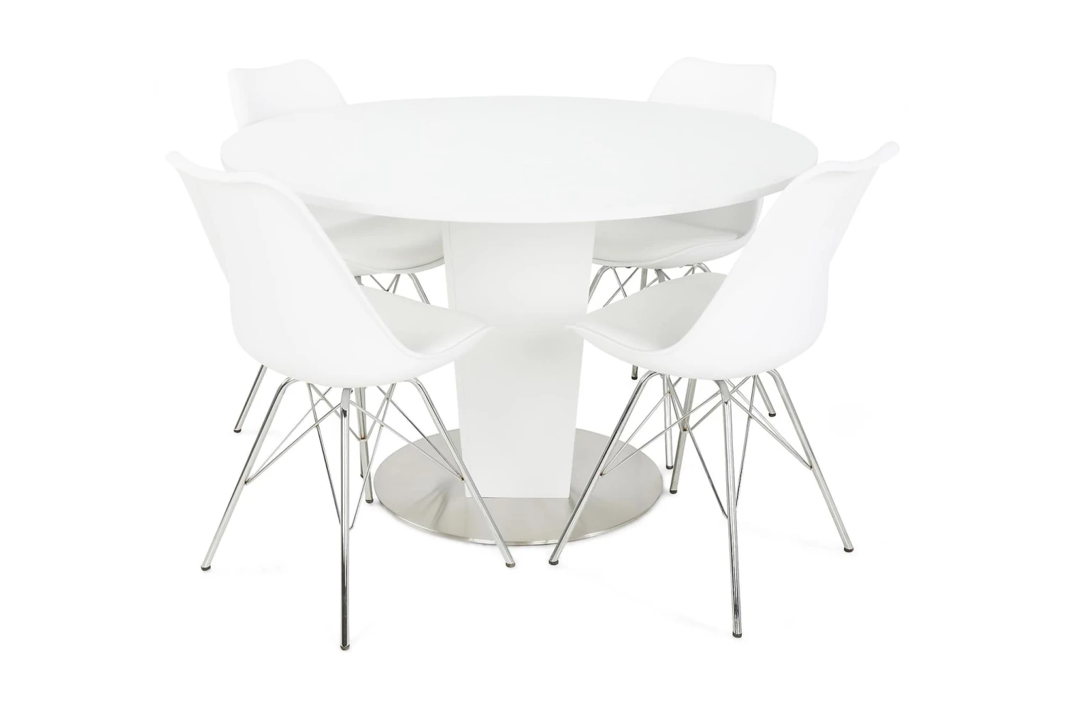 Cubic spisebord er et stilrent søjlebord med rund bordplade og kubisk stel. Bordet er et moderne spisebord i hvid højglans og krom, der passer perfekt i det moderne skandinaviske hjem. Cubic spisebord er fremstillet i holdbart MDF og overfladen er behandl