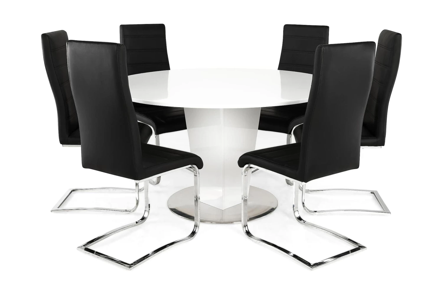 Diamond er et klassisk hvidt spisebord, som er fremstillet af stabilt og holdbar MDF og der medfølger seks spisebordsstole til dette sæt. Spisebordet har en højde på 76 cm og en diameter på Ø135 cm. Spisebordsstolene har en højde på 96 cm, en dybde på 53