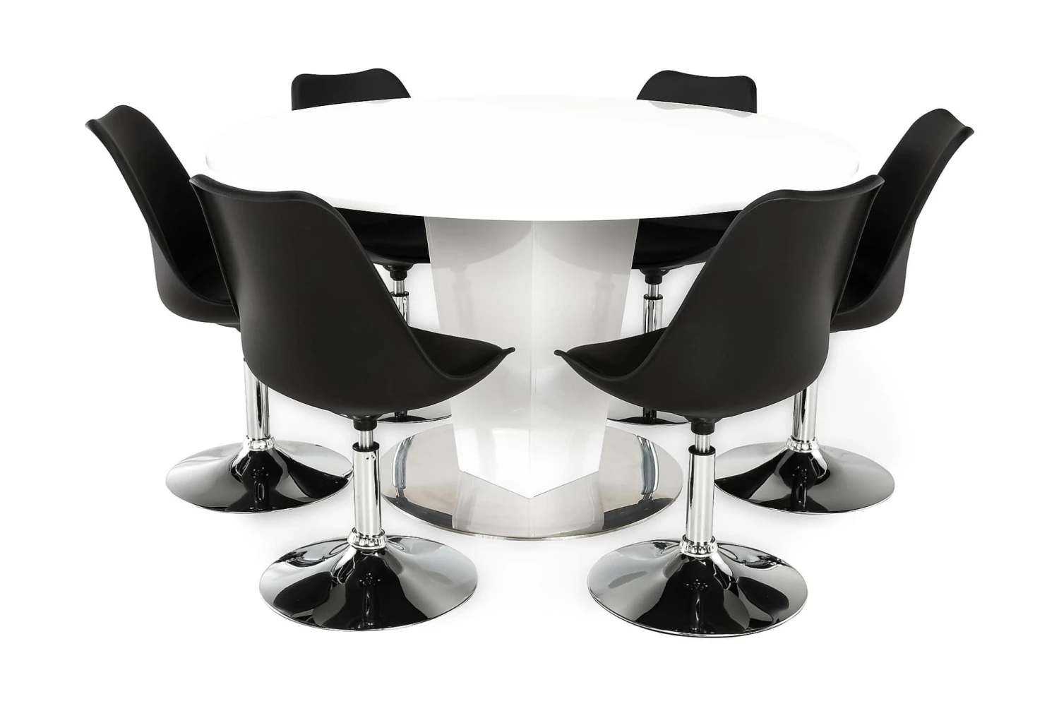 Diamond er et klassisk hvidt spisebord, som er fremstillet af stabilt og holdbar MDF og der medfølger seks spisebordsstole til dette sæt. Spisebordet har en højde på 76 cm og en diameter på Ø135 cm. Spisebordsstolene har en højde på 81 cm, en dybde på 52