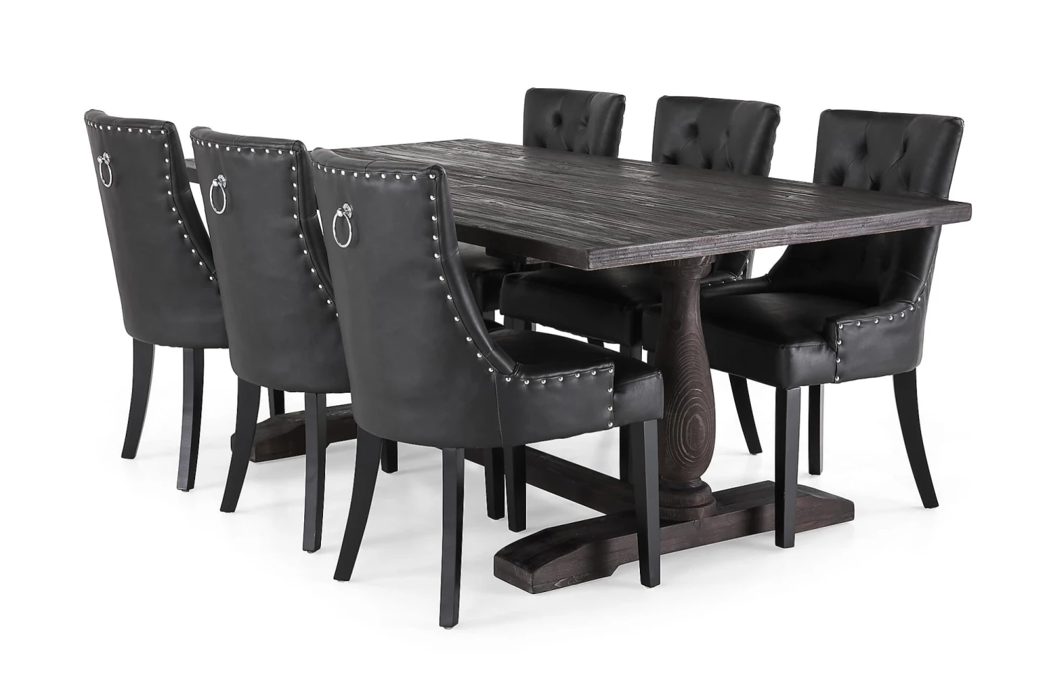 Dijon spisebordssæt er et rustikt og charmerende sæt, bestående af et aflangt spisebord i vintage grantræ og seks tilhørende spisebordsstole i sort kunstlæder. Små mærker og fordybninger på op til 5-6 mm er en naturlig del af håndværket og møblets design.