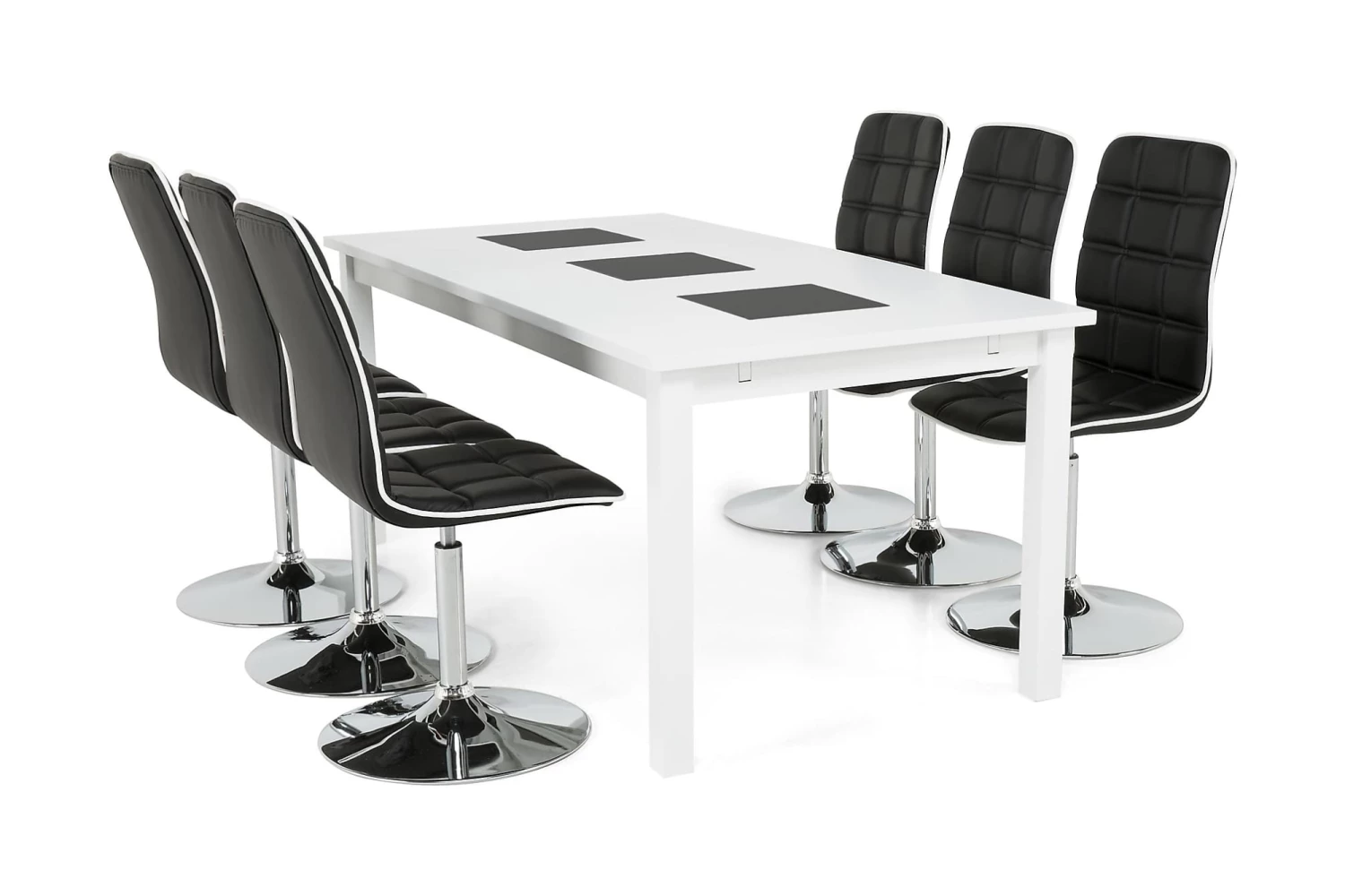 Jasmin spisebordssæt er et moderne og klassisk sæt bestående af et aflangt spisebord og seks tilhørende stole i sort kunstlæder. I en enkel og elegant farvekombination af sort og hvid, vil dette spisebordssæt være et stilsikkert valg til dit hjem. Spisebo