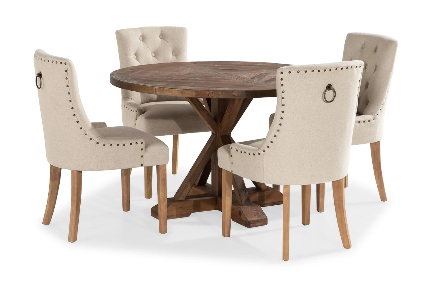 Lyon spisebordssæt er et klassisk og smukt sæt bestående af et rundt bord i voksbehandlet elmetræ, og fire tilhørende spisebordsstole i beigefarvet stof. Små mærker og fordybninger på op til 5-6 mm er en naturlig del af håndværket og møblets design. Disse