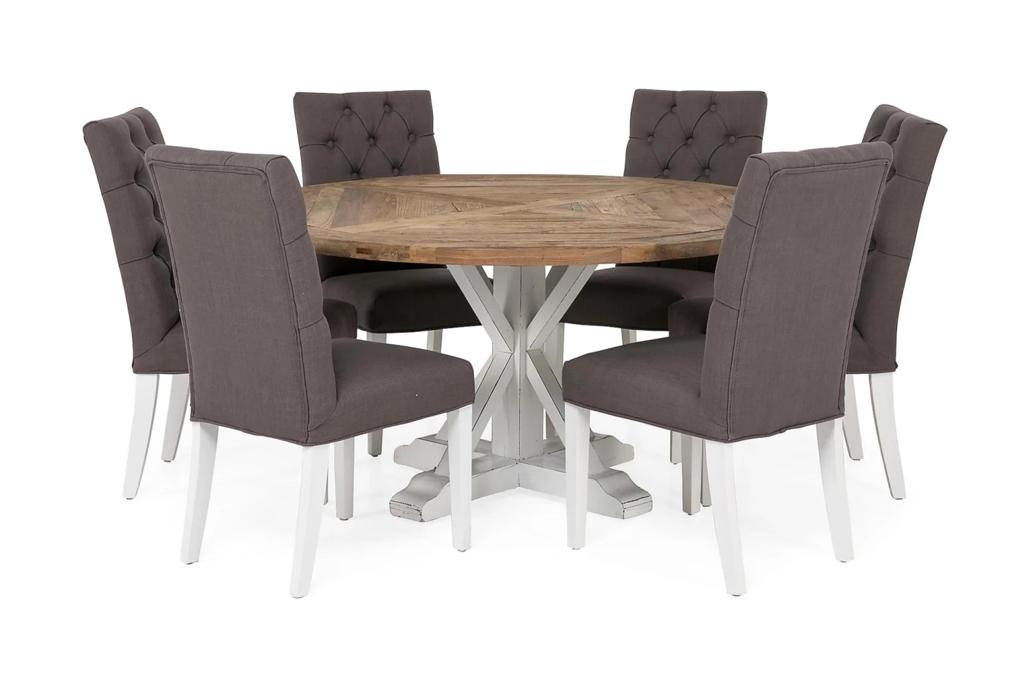 Lyon spisebordssæt er et klassisk og smukt sæt bestående af et rundt bord i voksbehandlet elmetræ, og seks tilhørende spisebordsstole i gråt stof. Små mærker og fordybninger på op til 5-6 mm er en naturlig del af håndværket og møblets design. Disse kan bl