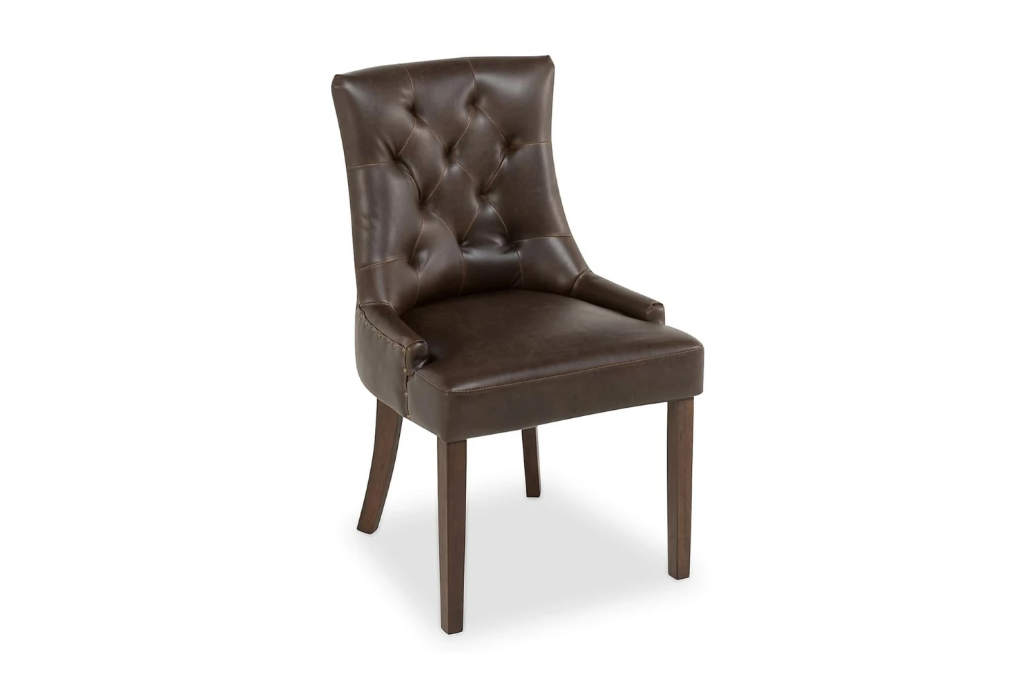 BEMÆRK, AT DENNE STOL KUN SÆLGES PARVIS OG DER SKAL DERFOR BESTILLES 2, 4 ELLER 6 STK. Tuva spisebordsstol er en robust spisebordsstol med fantastisk siddekomfort og lækker vintage karakter. Stolen er klædt i brunt kunstlæder (PU), der danner en blød og b