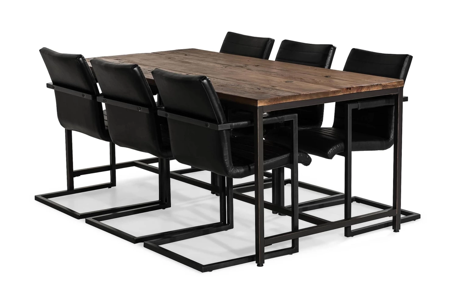Wilmer spisebordssæt passer rigtig godt ind i det moderne og rustikke hjem. Spisebordet har et metalstel og en bordplade af voksbehandlet elm. Bordpladen er et smukt håndværk, som er fremstillet af over 100 år gamle døre og møbler, som med tiden har givet